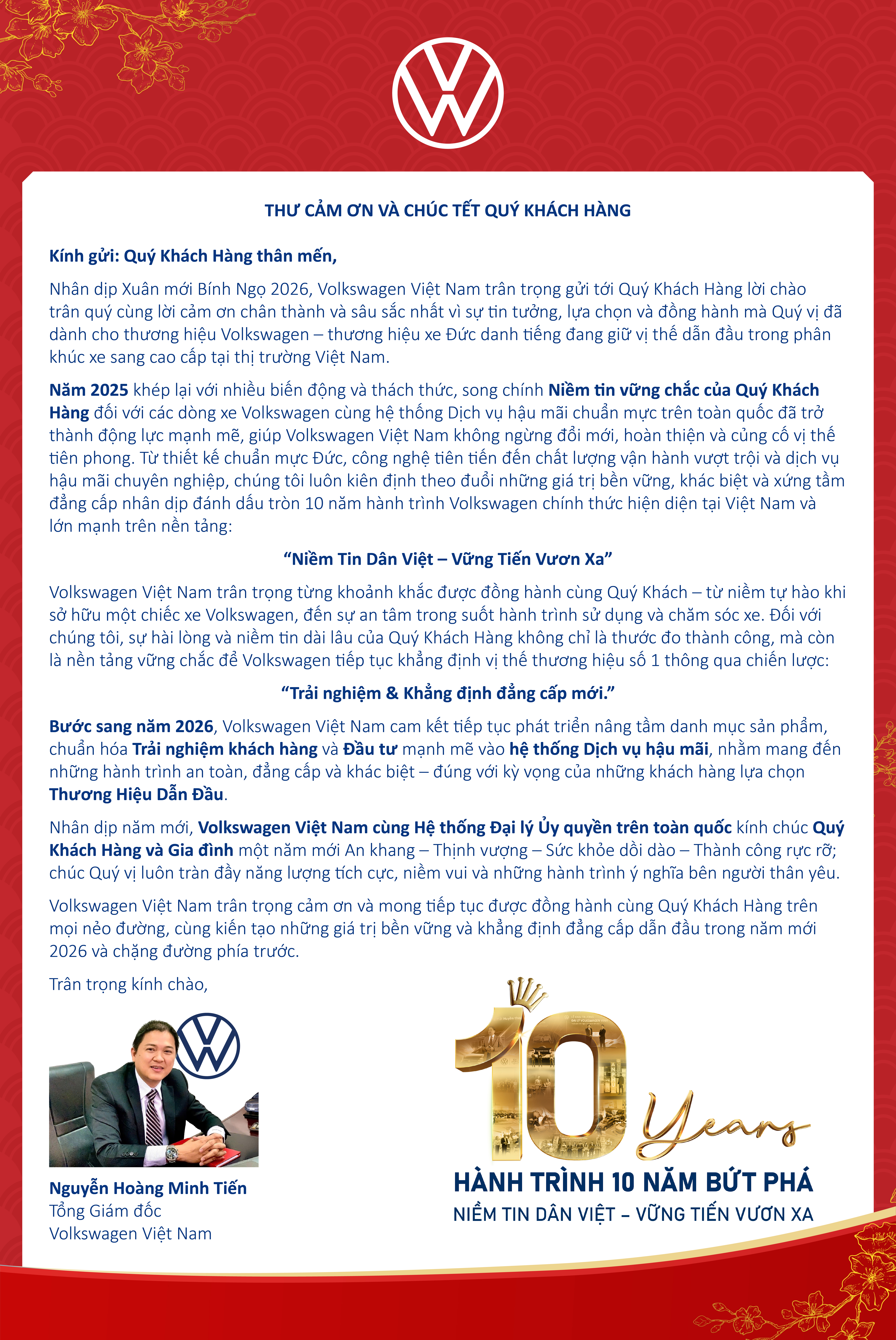 Thông qua Thư chúc Tết này, Volkswagen Việt Nam gửi gắm những kỳ vọng tốt đẹp cho một năm mới đầy cảm hứng, cùng Quý Khách Hàng vững tin đồng hành và tiếp tục chinh phục những cột mốc mới trên hành trình phía trước.
