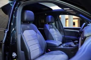 - Chất liệu ghế Da Varenna – Ghế phía trước vân carbon, có logo R-Line